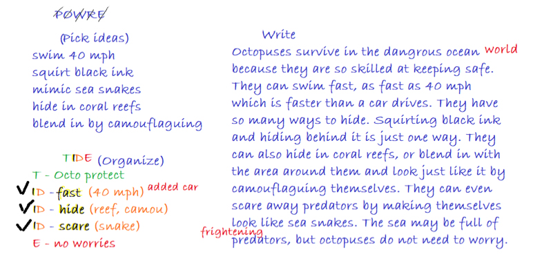 #3: Write together. Use brightly colored lined sketch pads and markers or fun pencils for writing sessions. Explain the ideas from the books you just read are so exciting that you want to journal about them. Explain that when we write, we can use a helpful writing process: pick ideas, organize them, write drafts, then revise and edit those (POWRE). POWRE is a tool to help us follow the full writing process whenever we write, such as a thank you note or about a trip, and can move on to longer and more diverse writing, such as a report. First, we pick (P) our ideas which might mean we list what we liked about the gift, a trip, or the books we just read. We might also pick (P) a list of words we would like to use in our writing. Next, we decide how to organize (O) our ideas, then write (W) a draft, and finally reread it for revisions (R) or edits (E) needed. Parents can scribe for children at this point. The example below illustrates writing about a fascination about octopuses. After reading several books about them, you can scribe as your child dictates. Demonstrate using POWRE to guide your child in using the full writing process to write about a favorite topic